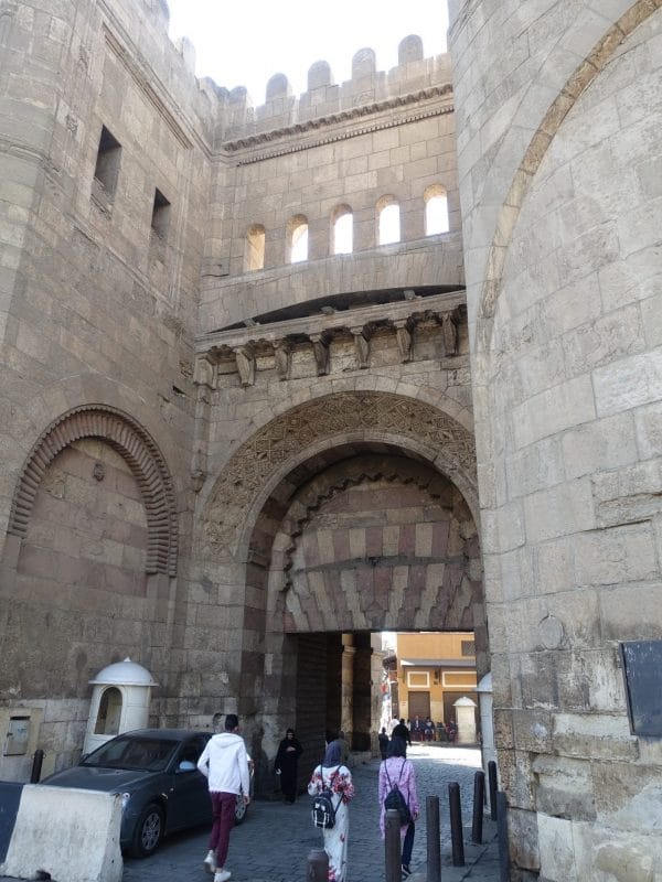 Wir werden vor einem großen Tor namens Bab al-Futuh abgesetzt. Bab al Futuh ist eines der drei verbliebenen Tore innerhalb der Mauern der Altstadt von Kairo, Ägypten. Sie wurde 1087 fertiggestellt und ist nach Norden ausgerichtet. Es befindet sich am nördlichen Ende der Muizz Street