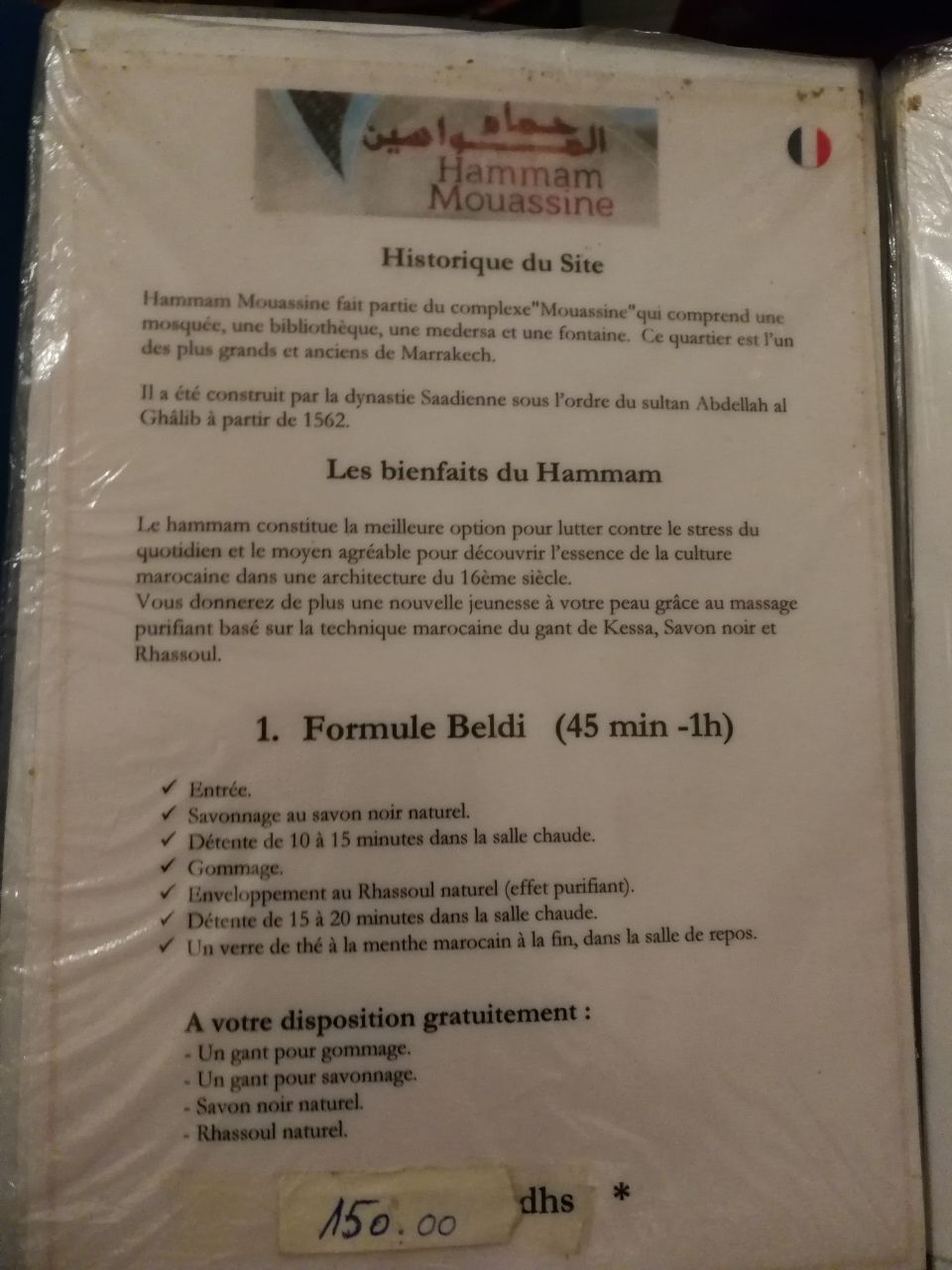 Der Besitzer begrüßt mich und zeigt mir die Speisekarte. Das ist die Grenze des traditionellen Hammams: Die Speisekarte ist in Englisch, Französisch und Spanisch erhältlich 🙂