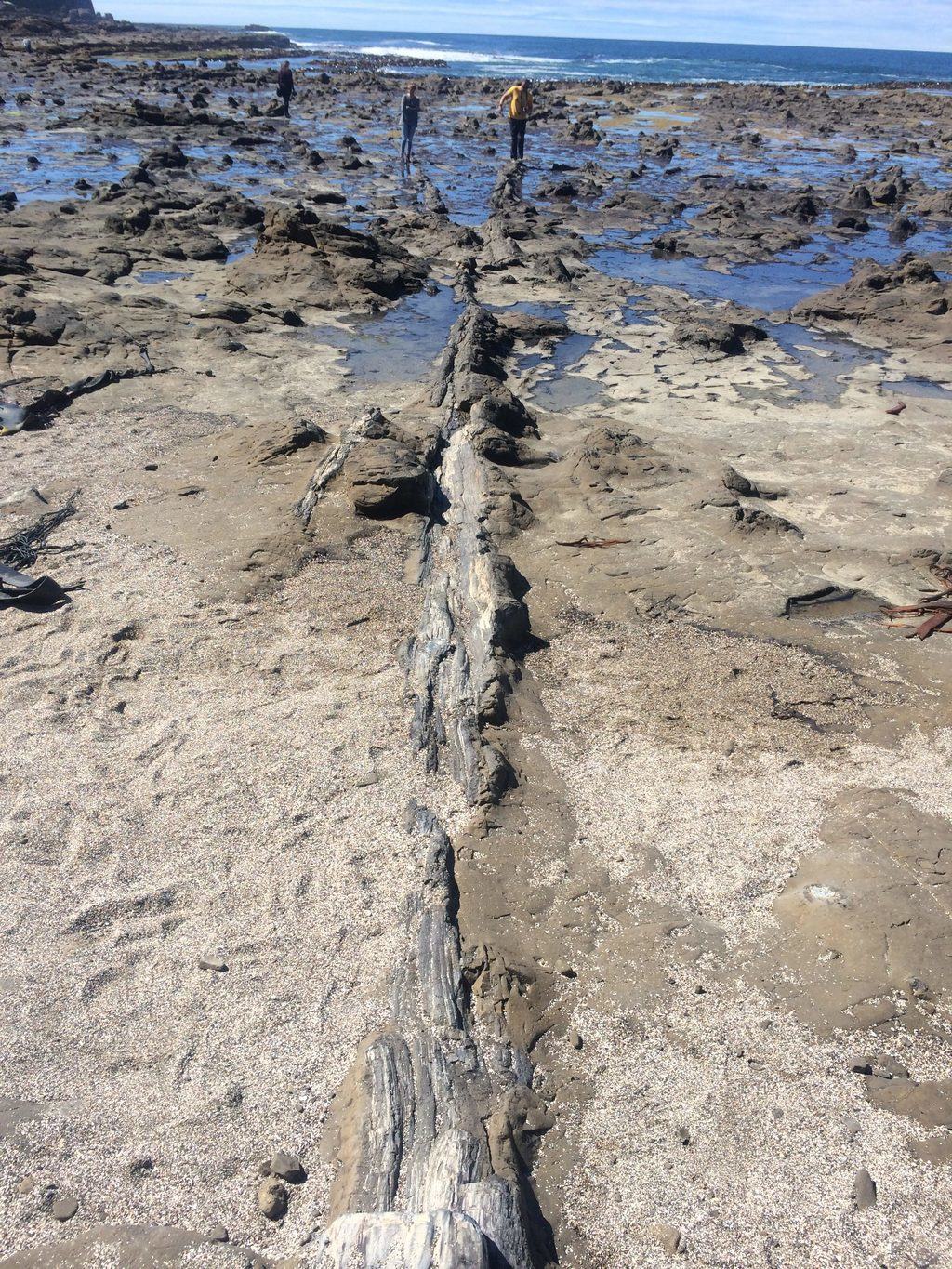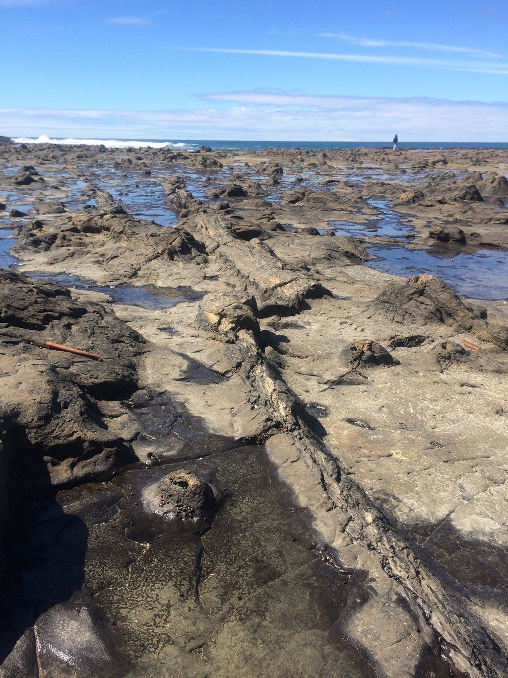 Anschließend fahren wir zur Curio Bay, um den versteinerten Wald (170 Millionen Jahre alt) zu sehen. Von den Vulkanen zerstört, können die Bäume nicht mehr stehen, aber wir können Spuren von langen Baumstämmen sehen, die vollständig versteinert sind. Einige skrupellose Touristen bringen sogar Fossilien als Souvenirs mit nach Hause (pfff). Ein Schild warnt uns mit der Botschaft „Dieser Wald ist schon seit 170 Millionen Jahren hier, warum jetzt aufhören?“. Hier können wir Pinguine bei Einbruch der Dunkelheit beobachten, eine sehr seltene Spezies, die weniger scheu ist als an anderen Orten Neuseelands.