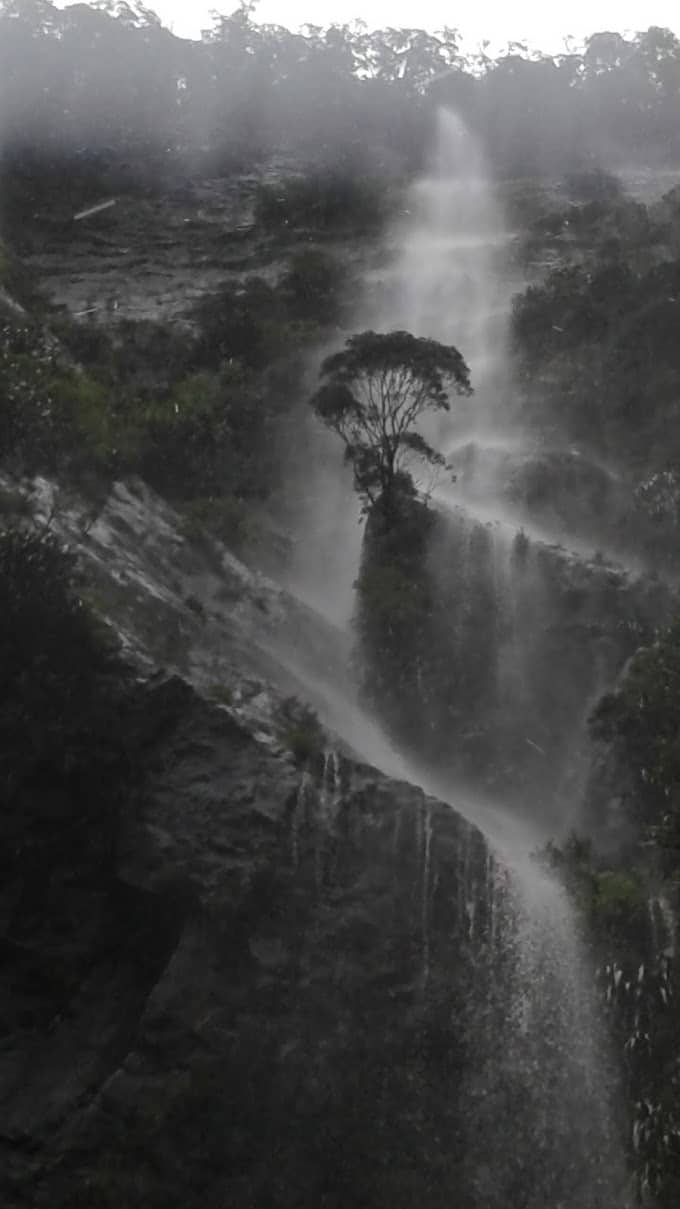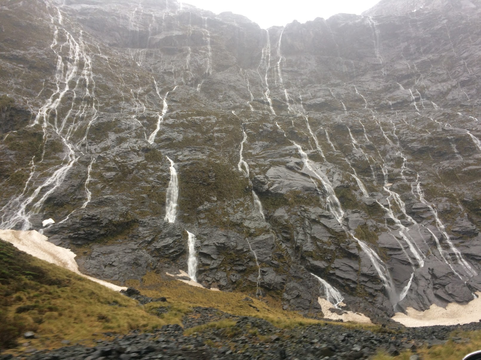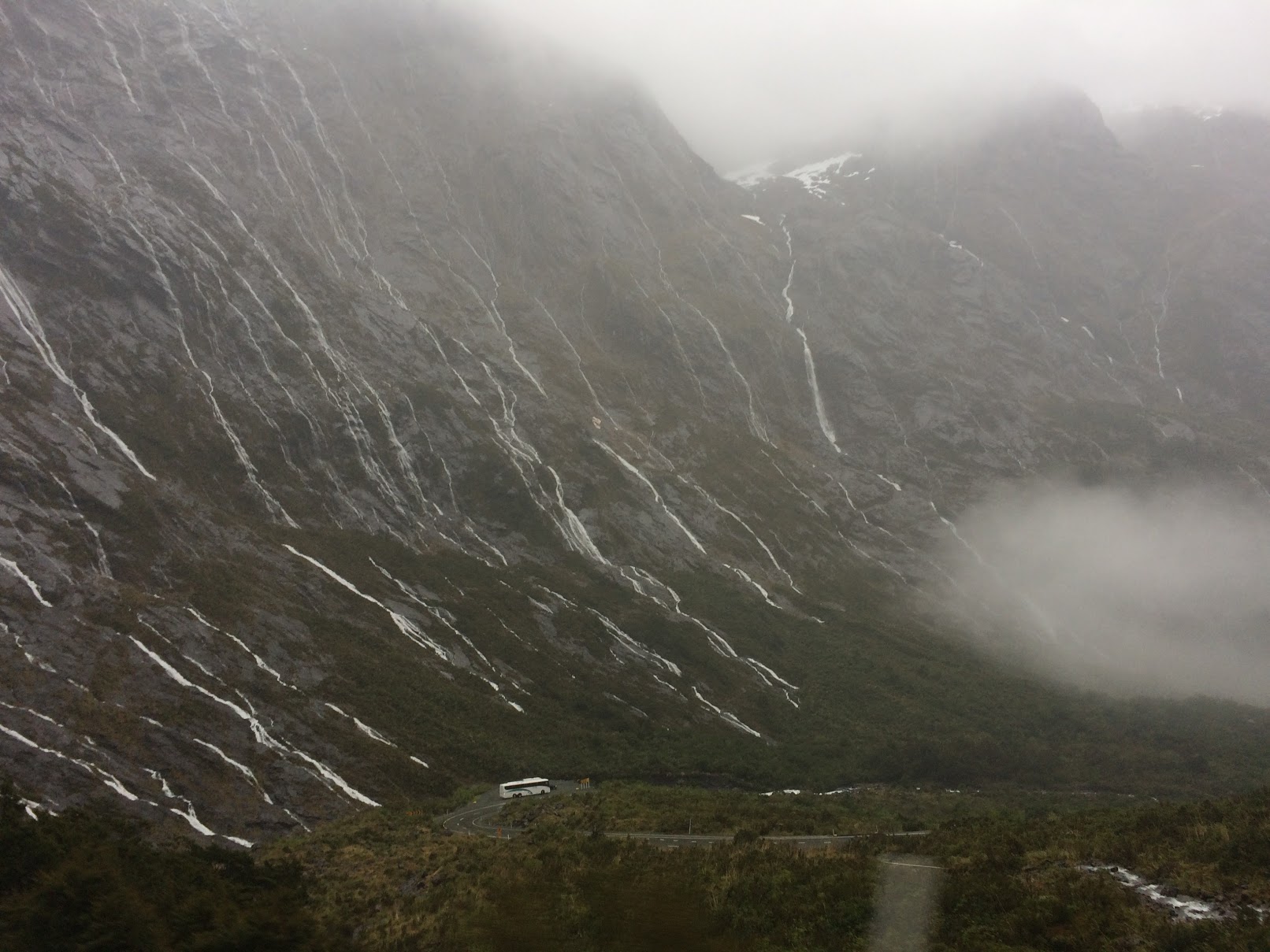 Im Gegensatz zu gestern regnet es in Strömen, was das Fahren erschwert. Bei so vielen engen Kurven und Steigungen verbrauchen wir viel Kraftstoff, aber die Aussicht ist atemberaubend: Hunderte von Wasserfällen schmücken die Berge auf unserem Weg, die meisten davon gibt es bei schönem Wetter gar nicht. In dieser Region, die 9 Meter Regen pro Jahr (im Vergleich zu „nur“ 3 Metern für den Amazonas) und 2 von 3 Regentagen verzeichnet, können wir uns nicht unglücklich schätzen, an einem Regentag zu kommen. Nebel, Wasserfälle, weithin sichtbare Gletscher, halb sichtbare Schneegipfel… all das ergibt ein beeindruckendes Schauspiel, wie in einem Traum