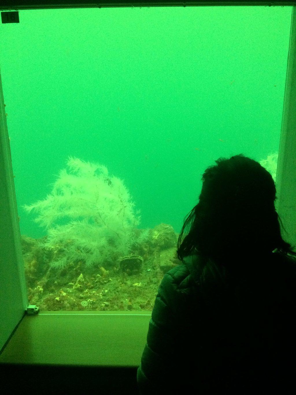 Wir halten für eine Stunde an der schwimmenden Unterwasser-Sternwarte. Dieses Observatorium, das ursprünglich für die Forschung geschaffen wurde, ist aus finanziellen Gründen verpflichtet, sich für die Öffentlichkeit zu öffnen. Es bietet eine von Vitrinen umgebene Kapsel in einer Tiefe von 10 m. Wir werden also Meeresbewohner sehen, die sich in die Nähe des Observatoriums wagen. Der Besuch ist interessant, aber wegen des Regenwassers, das sich in den Fjord ergießt, haben wir weniger Sicht als sonst. Wir können ein paar kleine Fische beobachten, aber keine Haie, über die wir berichten könnten, und kein spannendes Erlebnis. Ich denke, es hängt von jedermanns Glück ab. Wenn Sie jemals tauchen waren, ist dieses Observatorium von geringem Interesse