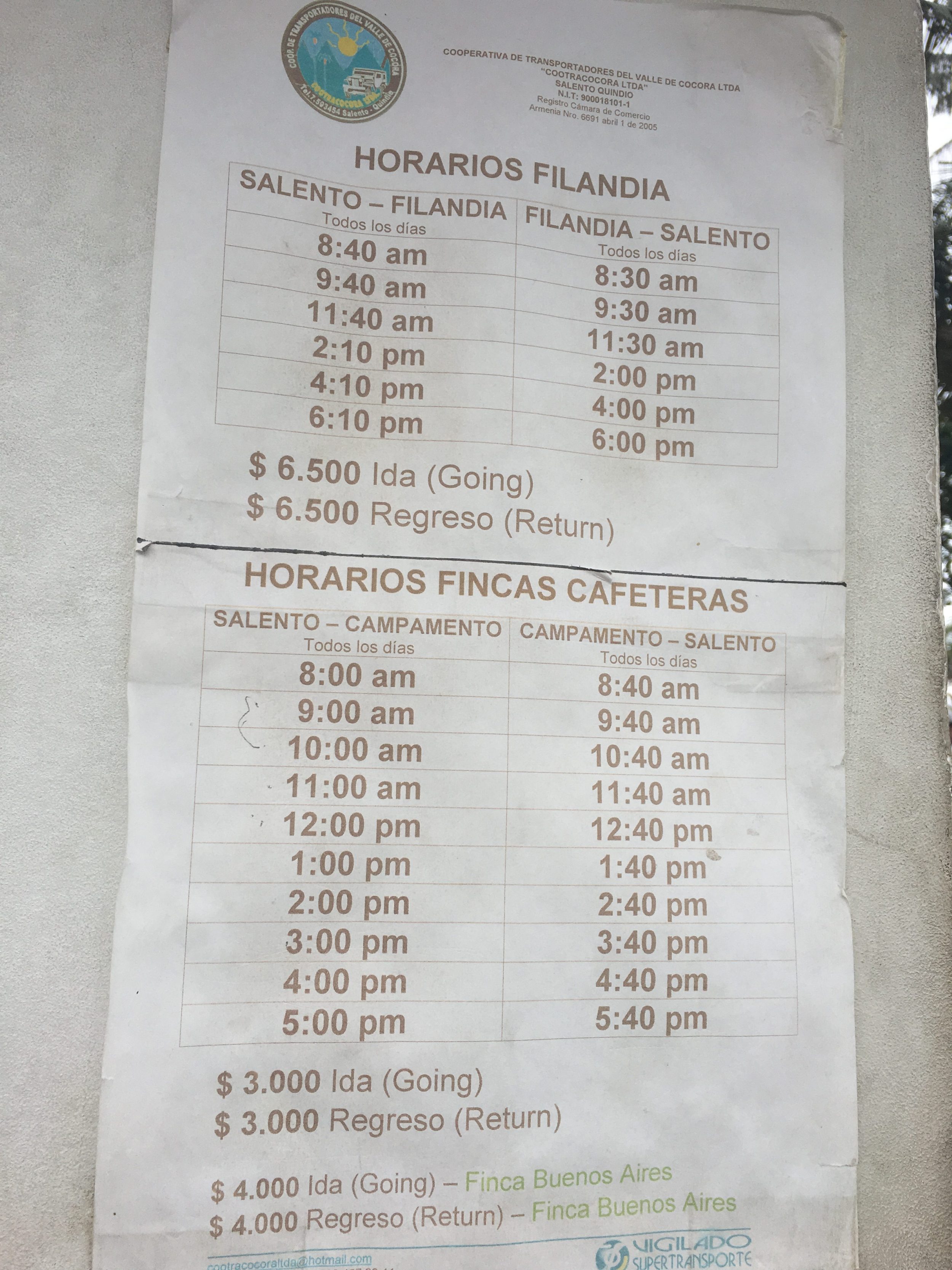 Option 2: Es gibt einen direkten Bus, der jeden Tag zwischen Salento und Medellin fährt. Fahrpläne: 8h, 10h, 16h. Kosten: 54.000COP/Person