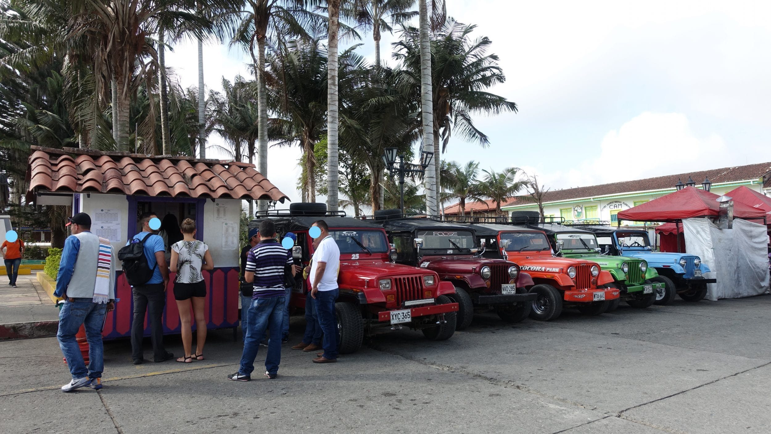 Vom Hauptplatz in Salento fahren Jeeps zu den Fincas (Kaffeefarmen) und ins Cocora-Tal. Kaufen Sie Fahrkarten an der Kasse oder direkt beim Fahrer (wenn die Kasse geschlossen ist).