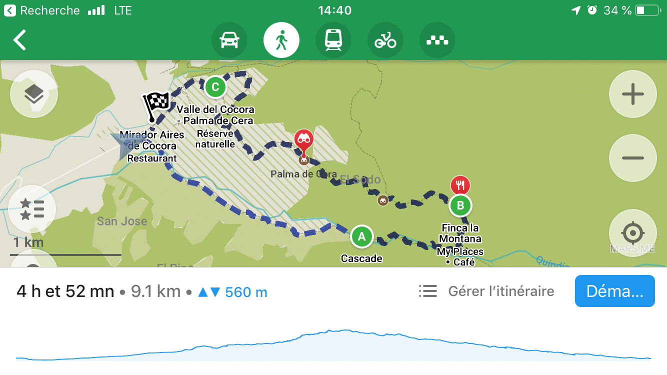 - Sie gehen zurück und folgen dem Pfeil, der Finca la montaña (Punkt B) anzeigt. Dann geht es für 2h-2h30 hinunter, während Sie durch den Palmenwald (Punkt C) birfuing. Sie beenden die Wanderung in Schönheit.
