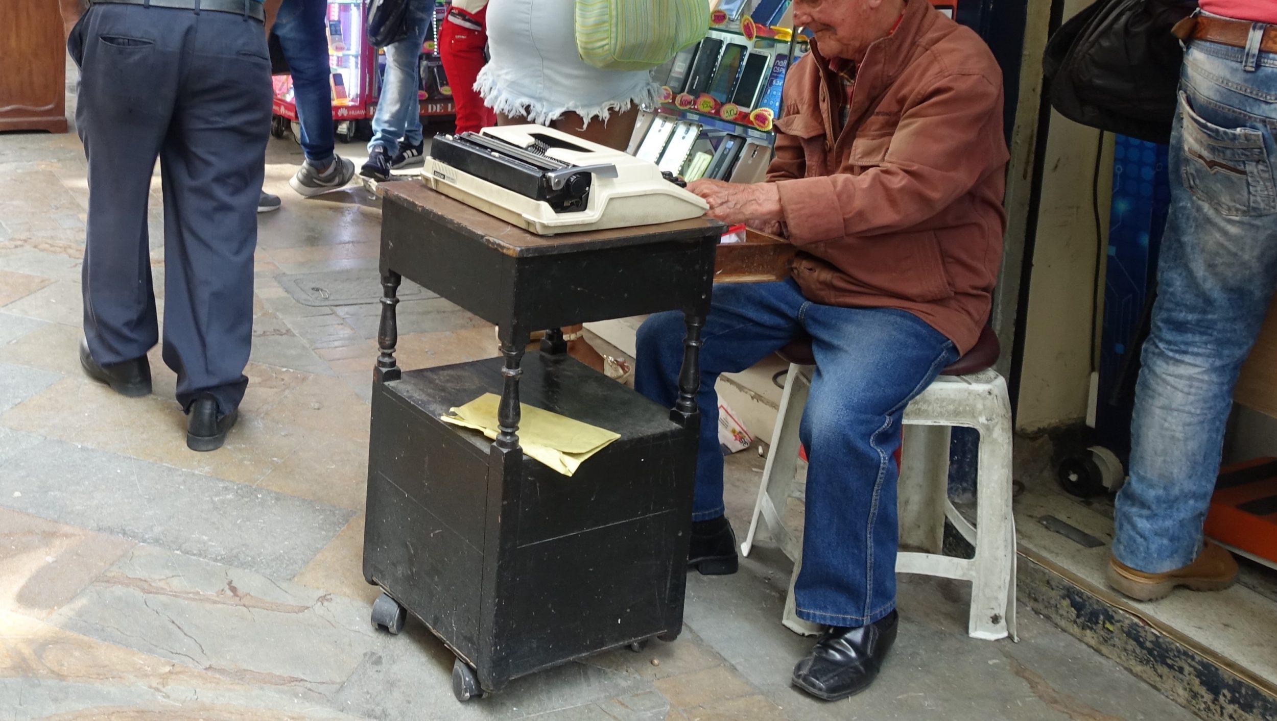 In den kleinen, rechtwinklig zueinander verlaufenden Straßen sehen wir Herren mit Schreibmaschinen, die den Analphabeten einen sehr nützlichen Dienst erweisen. Ein Stück weiter zeigt ein Schild 100COP/mn Kommunikation an. Dies ist das Äquivalent zu einer Telefonzelle, nur dass es sich um ein Smartphone handelt, das an einen Tisch gekettet ist, und der Verkäufer selbst die Kommunikationszeit überwacht.