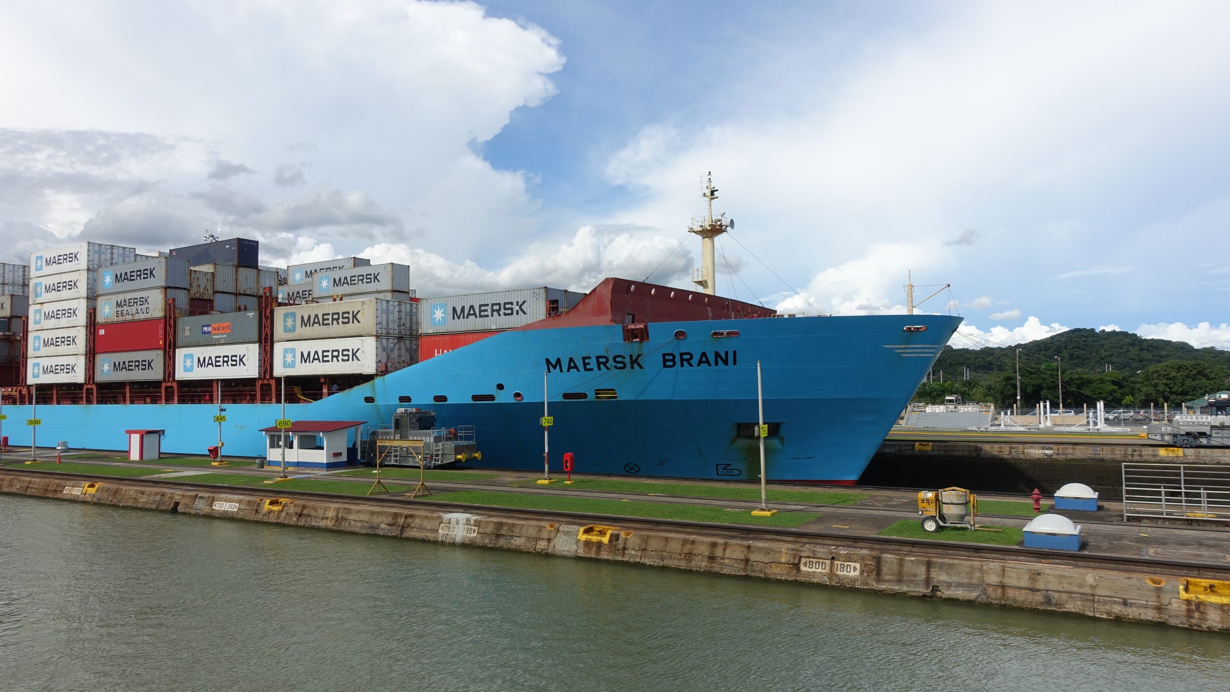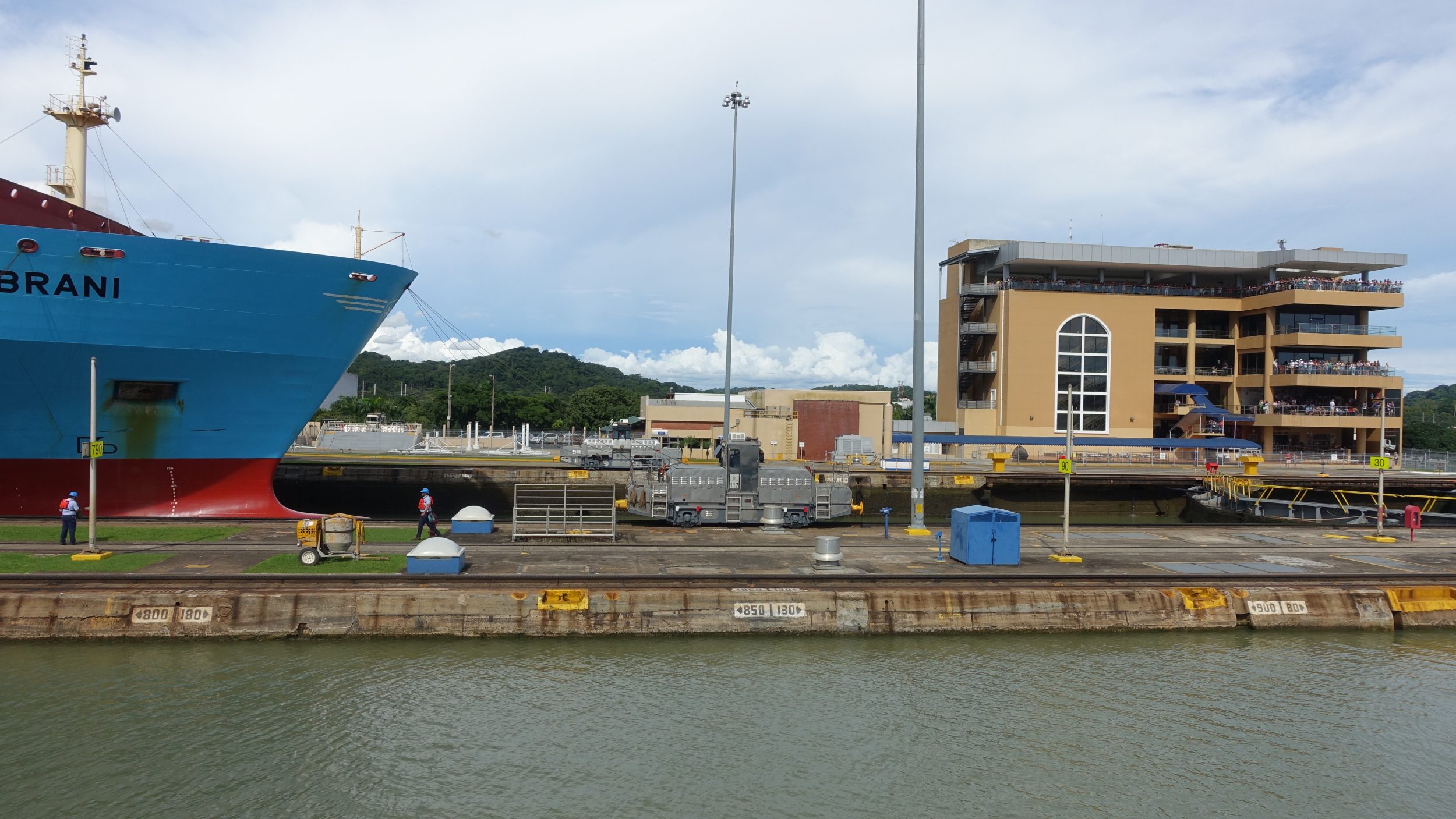 Bei der Durchfahrt durch die Schleusen haben die sehr großen Boote nur sehr wenig Spielraum und werden von 8 Lokomotiven unterstützt, die sie nicht ziehen, sondern das Boot nur geradeaus fahren lassen, ohne gegen die Schleusenwände zu stoßen.