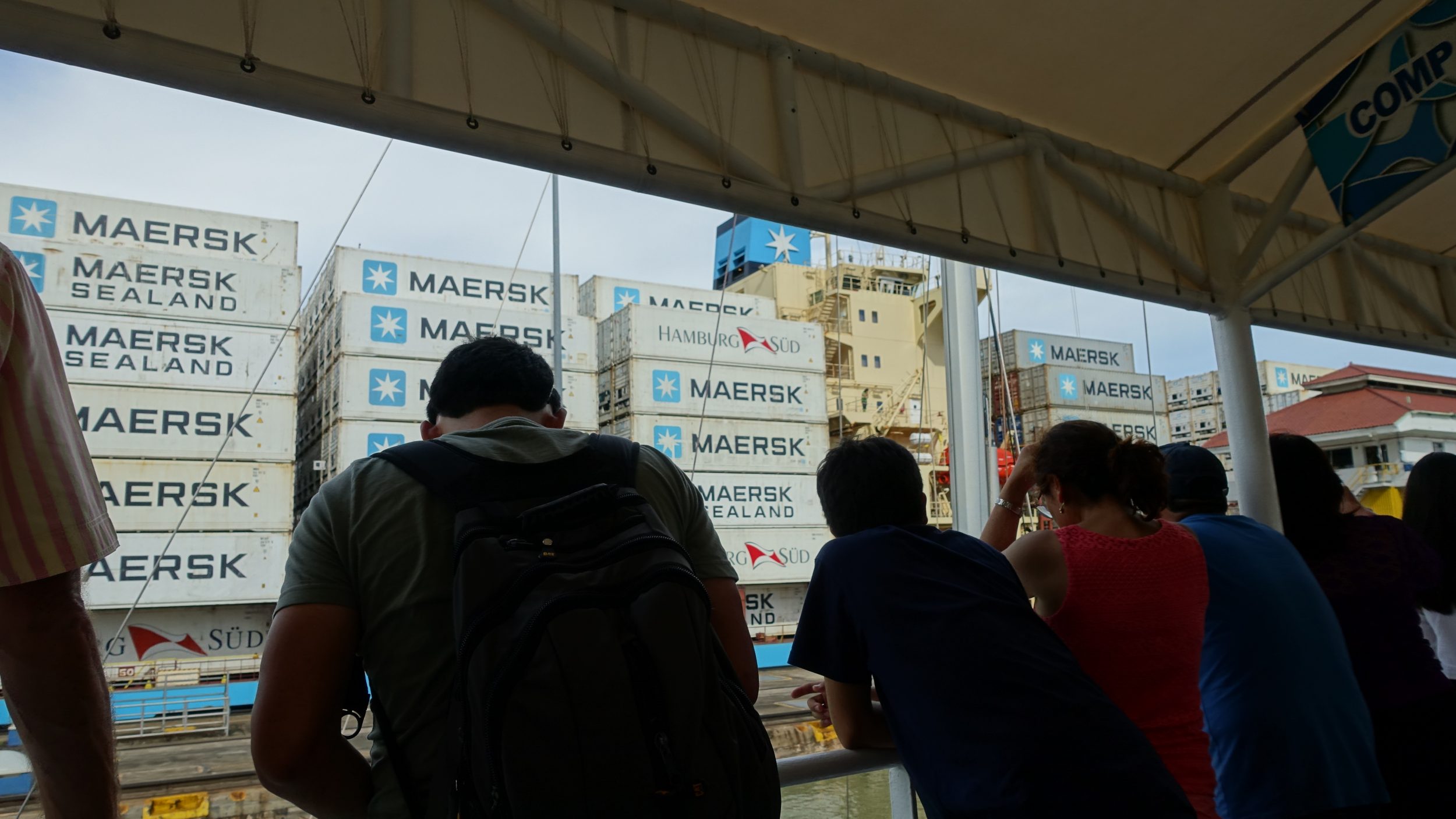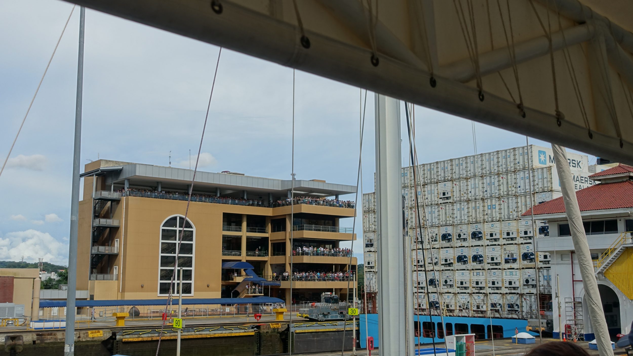 Aber wir hatten großes Glück, denn auf der nächsten Spur passiert ein riesiges Containerschiff, Panamax, die Schleusen von selbst und es ist ein einmaliger Anblick.