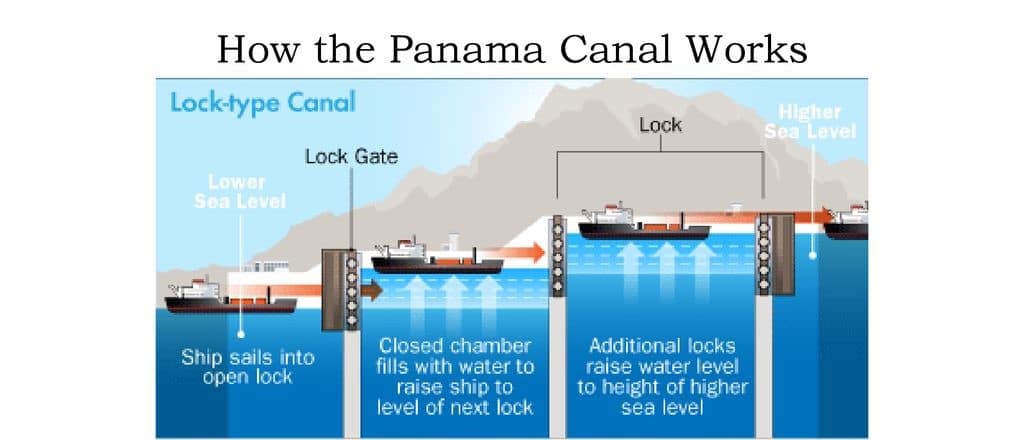 Im Gegensatz zum Suezkanal, der auf Meereshöhe liegt, hat der Panamakanal mehrere Schleusen. Der Panamakanal ist 77 km lang und durchquert den Isthmus von Panama, um den Pazifischen und den Atlantischen Ozean zu verbinden.