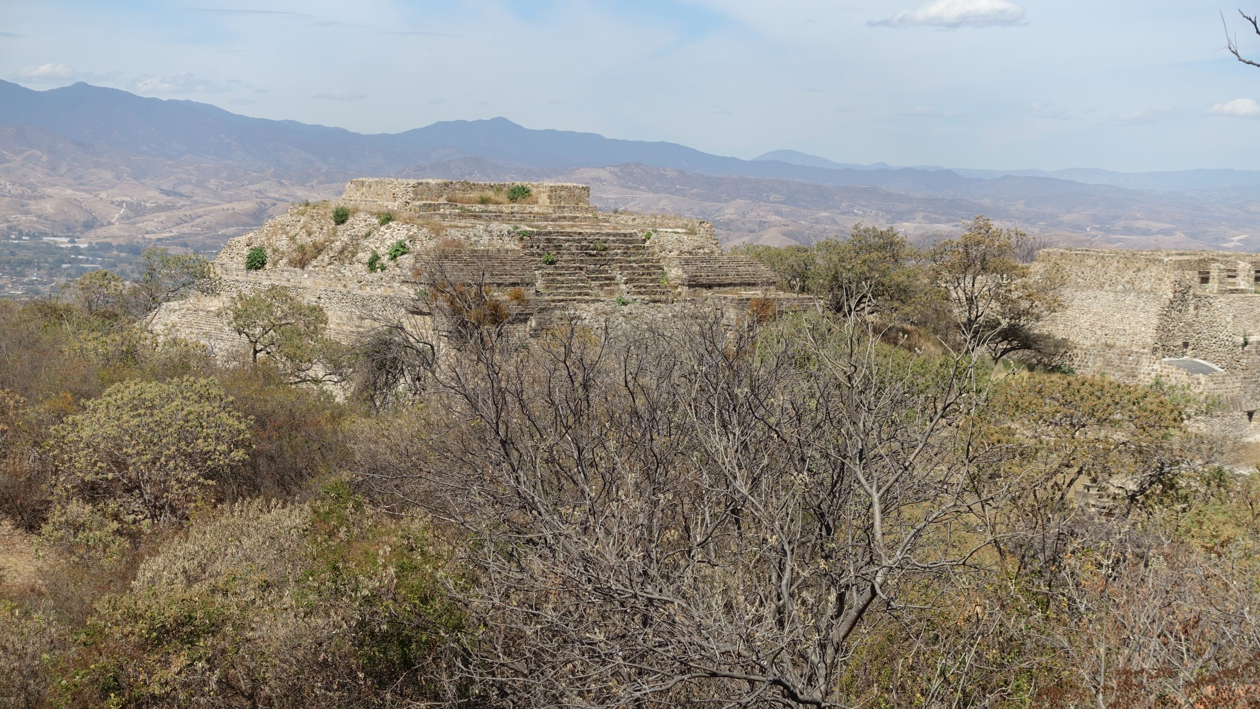 Wir kommen am Monte Alban an, was „weißer Berg“ bedeutet, weil im Winter die Bäume hier mit weißen Blüten bedeckt sind und es so aussieht, als sei der Berg mit Schnee bedeckt. Hier befindet sich eine der beiden archäologischen Stätten um Oaxaca. Monte Alban ist nur eine fünfzehnminütige Fahrt vom Stadtzentrum entfernt und es gibt Colectivos , die im Süden der Stadt abfahren, wenn Sie unabhängig dorthin fahren möchten.