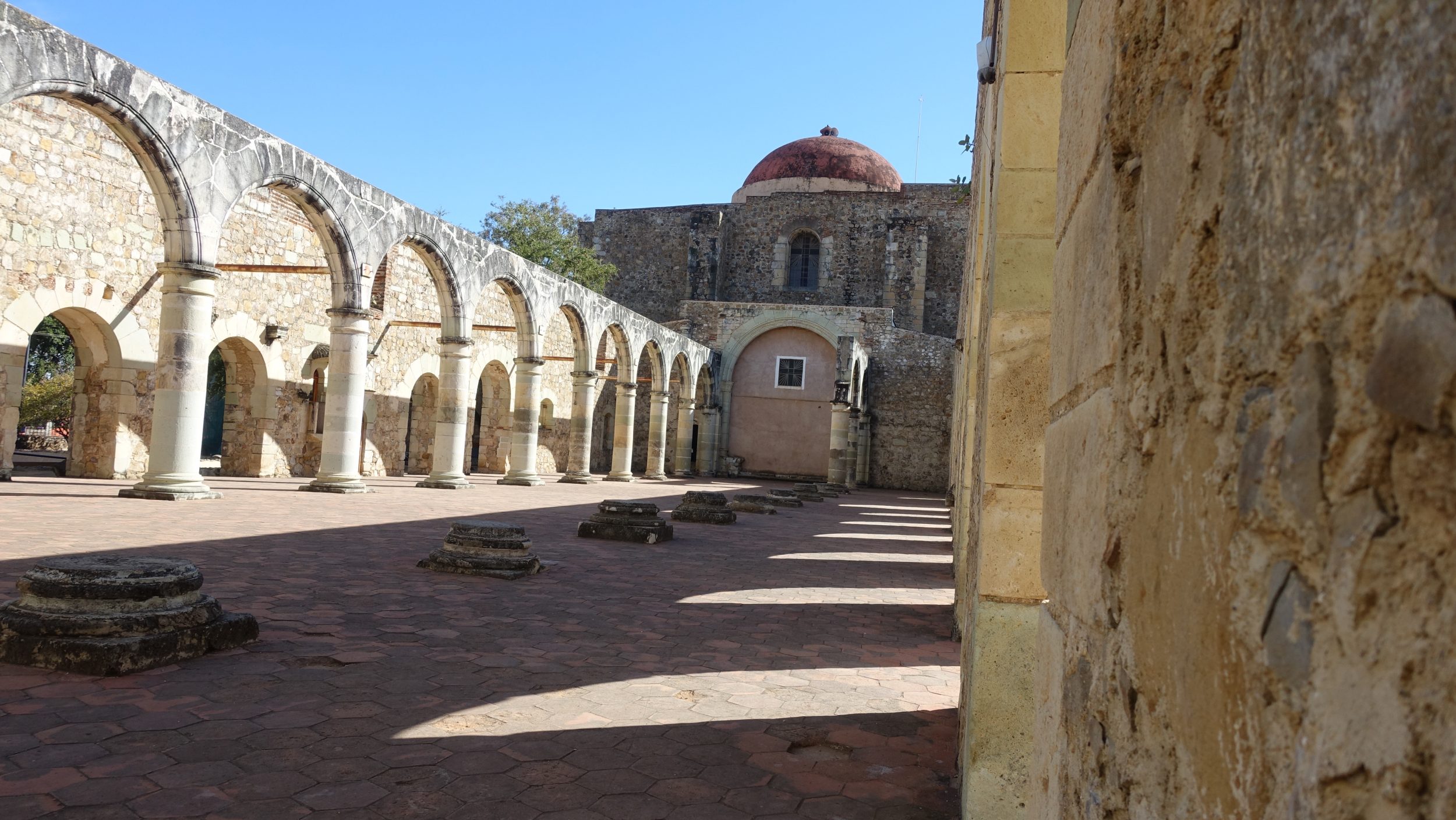 Alles ist offen, es gibt 21 Eingangstüren und der Führer erklärt uns, dass die Spanier, als sie mit ihrer Religion ankamen, ihren Glauben predigen wollten, aber die Eingeborenen, die noch nie in ihrem Leben ein Gewölbe gesehen hatten, hatten große Angst, hineinzugehen. Also schufen sie eine offene Struktur – damit sie keine Angst mehr hatten – und behielten die Gewölbe und die Säulen bei.