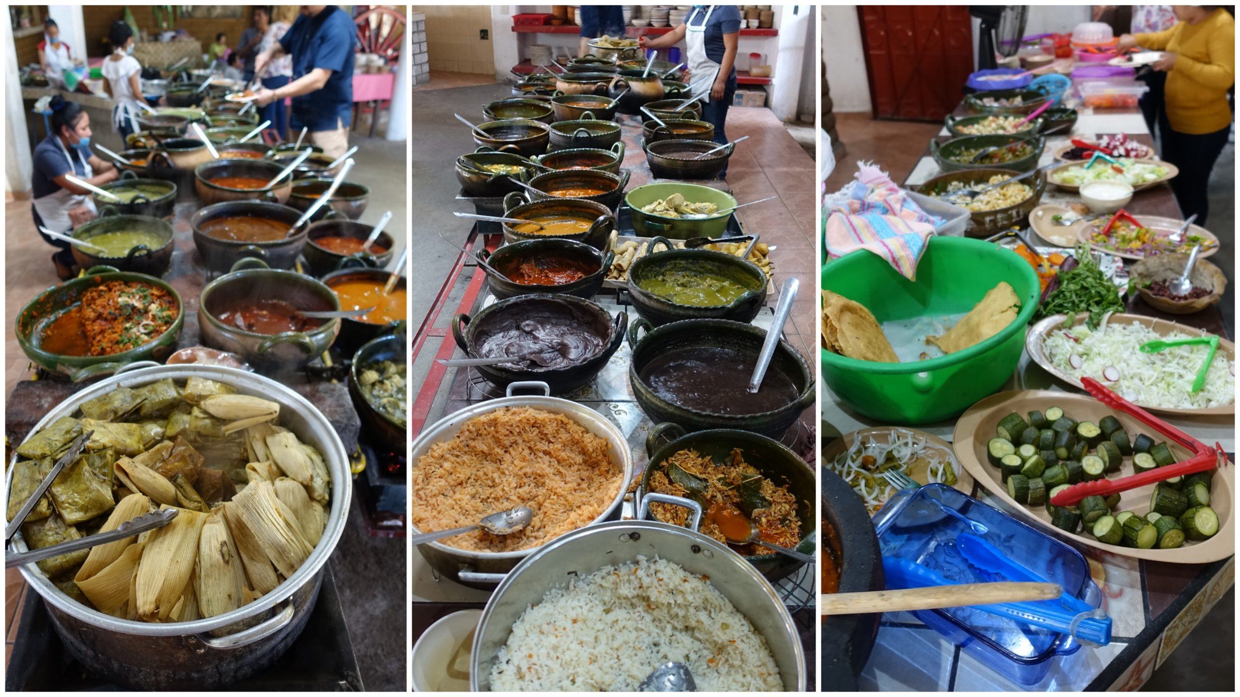 Was man unbedingt probieren muss, wenn man nach Oaxaca kommt, ist das Tamale, eine Art gefüllter Teig, der gedämpft wird – es erinnert mich an das vietnamesische „Banh Gio“, natürlich nicht so gut. Und die 6 Maulwürfe (mit unterschiedlichen Farben). Dies sind Soßen, die mit ???? hergestellt werden (ich erinnere mich nicht an die Namen der Zutaten), die den Geschmack von Reis und Fleisch verbessern. Die Qualität der Maulwürfe hängt stark von der Person ab, die sie zubereitet. In diesem Fall: in diesem Restaurant ist es sehr durchschnittlich, aber wir haben einen sehr guten Verkäufer von mole negro in Oaxaca gefunden. Kosten für das Buffet: 150MXN + Getränk (15 bis 20MXN) + Trinkgeld