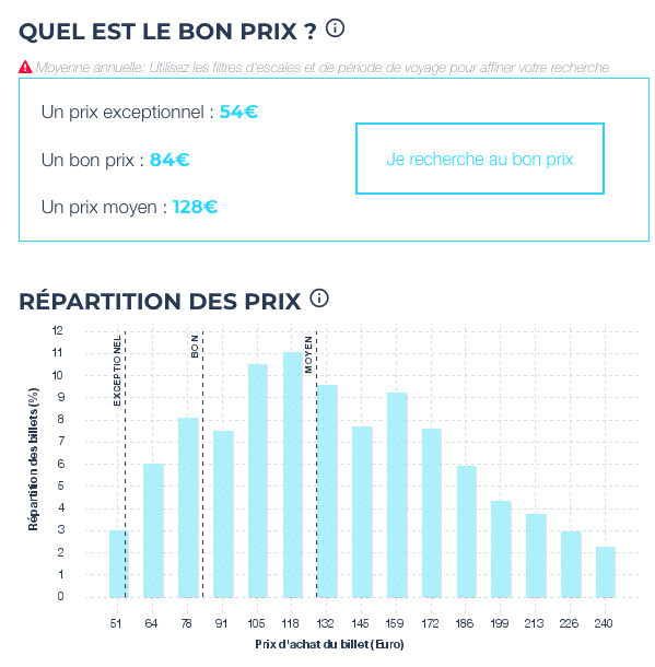 In diesem Beispiel für einen einfachen Flug Paris – Rom schätzt Algofly, dass der Durchschnittspreis 128 € beträgt, 84 € ist ein guter Preis und 54 € ist ein außergewöhnlicher Preis. Je nachdem, welcher Preis Ihnen angeboten wird, können Sie sich entscheiden, schnell zu buchen oder abzuwarten, wie es sich entwickelt.