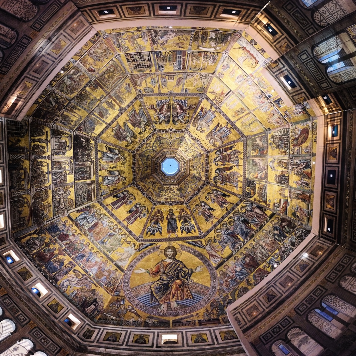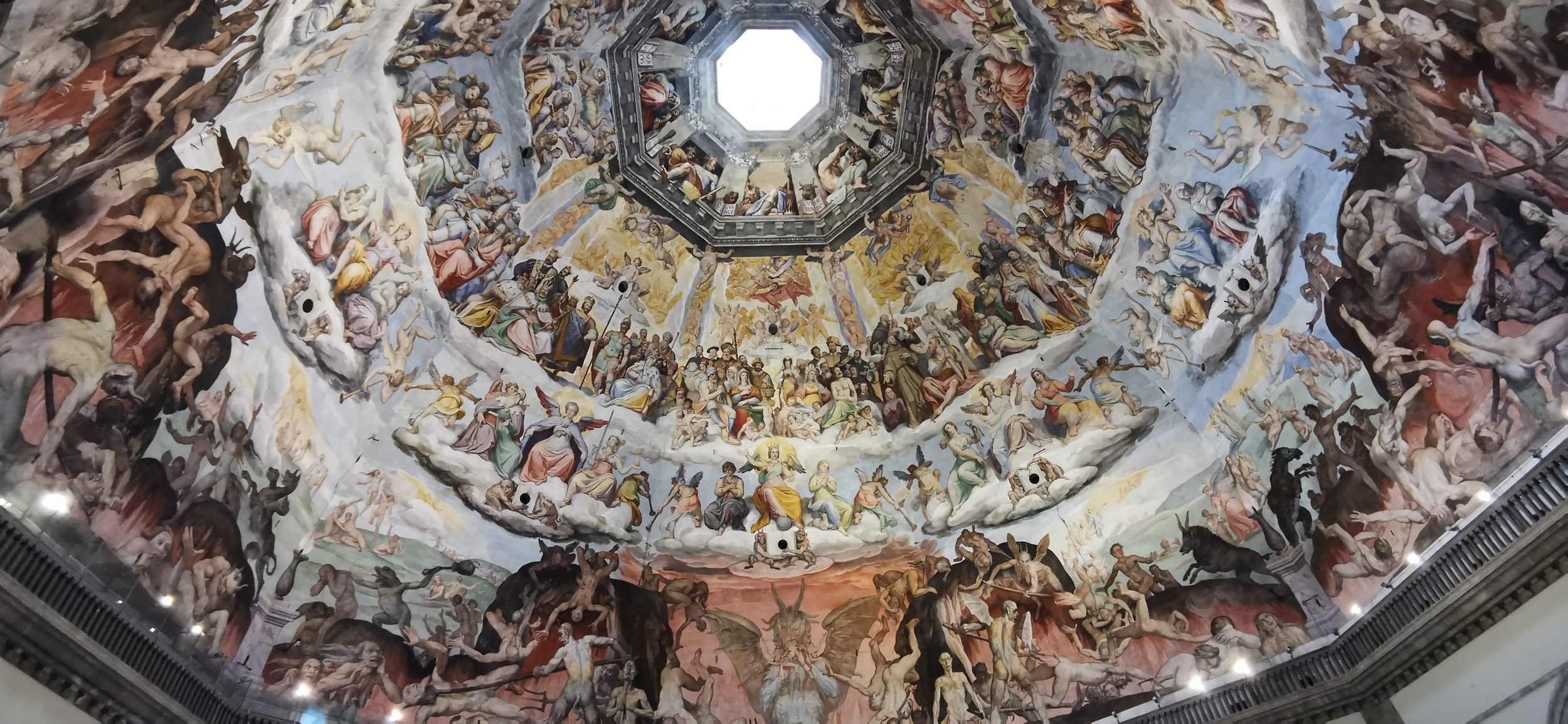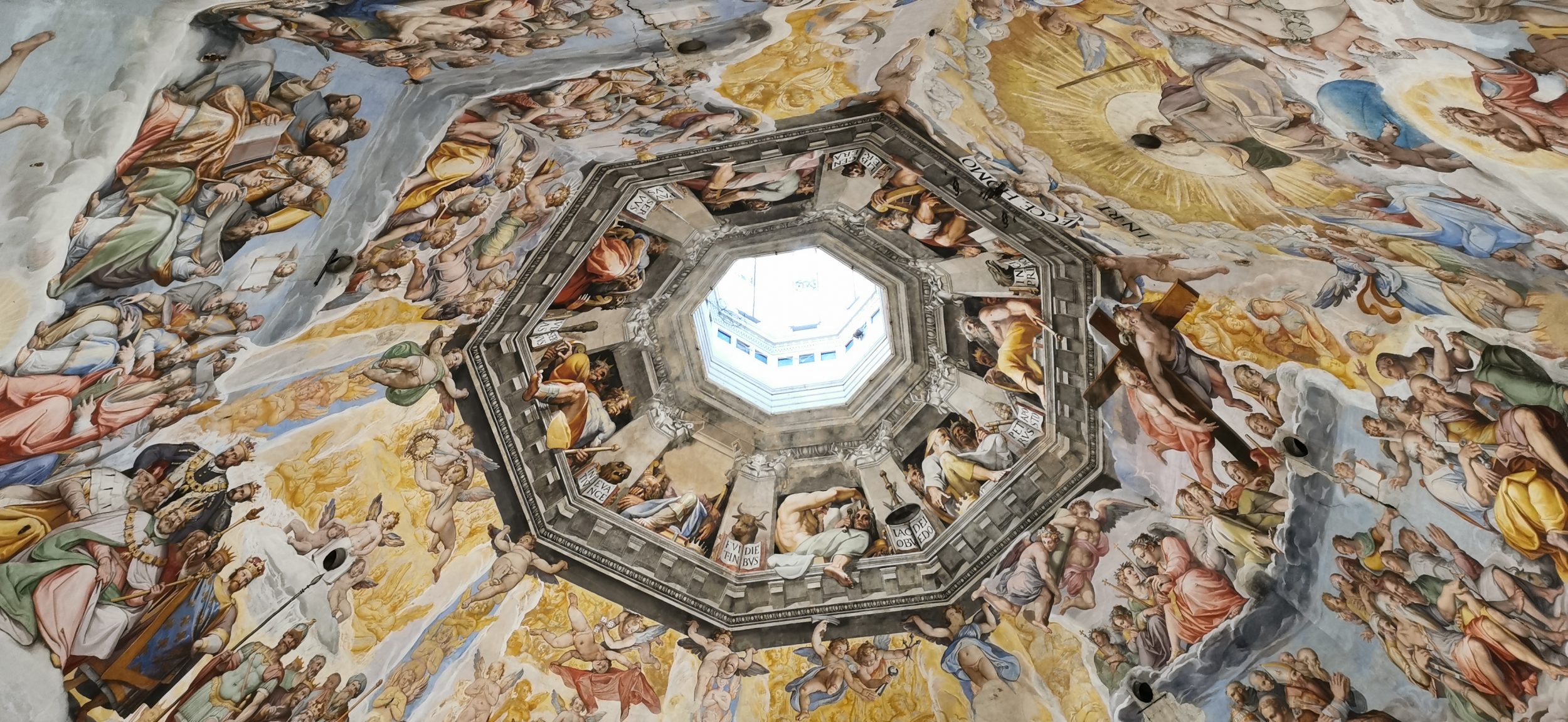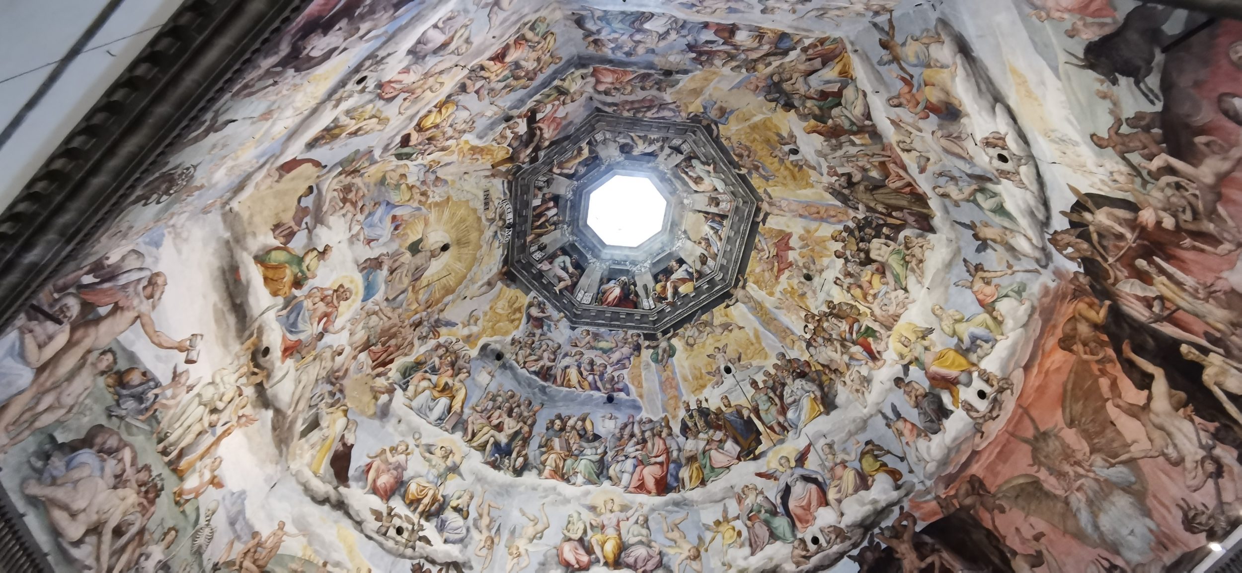 Auf dem Rückweg nehmen wir einen anderen Weg (ein Mitarbeiter verscheucht uns nach 15 Minuten und sorgt dafür, dass wir die richtige Treppe nehmen) und durchqueren den Gang von oben. Hier ist der Blick, den wir am Fuß der Kuppel haben. Atemberaubend! Wir haben das Gefühl, Gott sehr, sehr nahe zu sein.