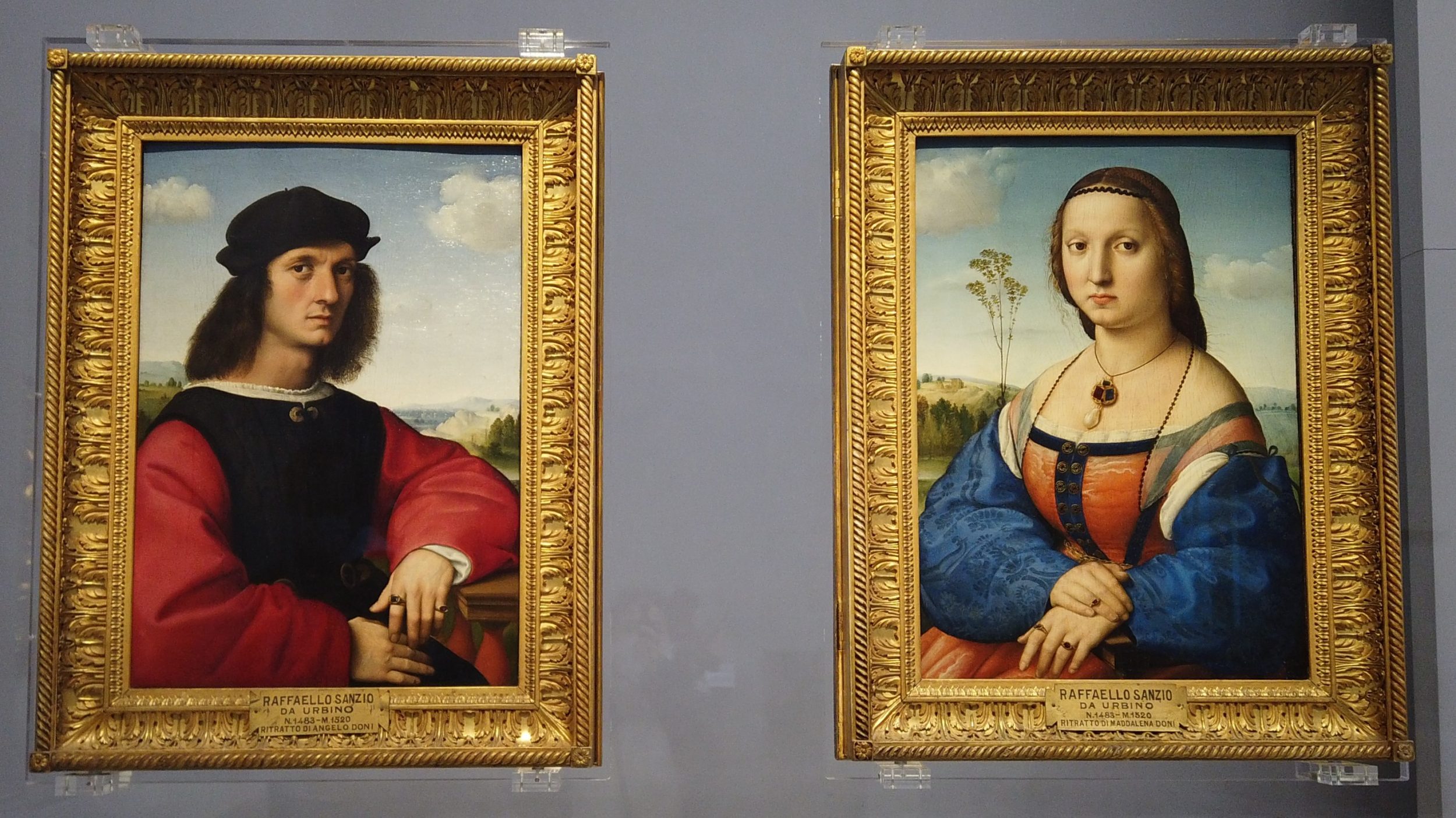 Es gibt doppelseitige Gemälde, sehr gut hervorgehoben, wie diese. Hinter dem Porträt sehen wir Landschaften.