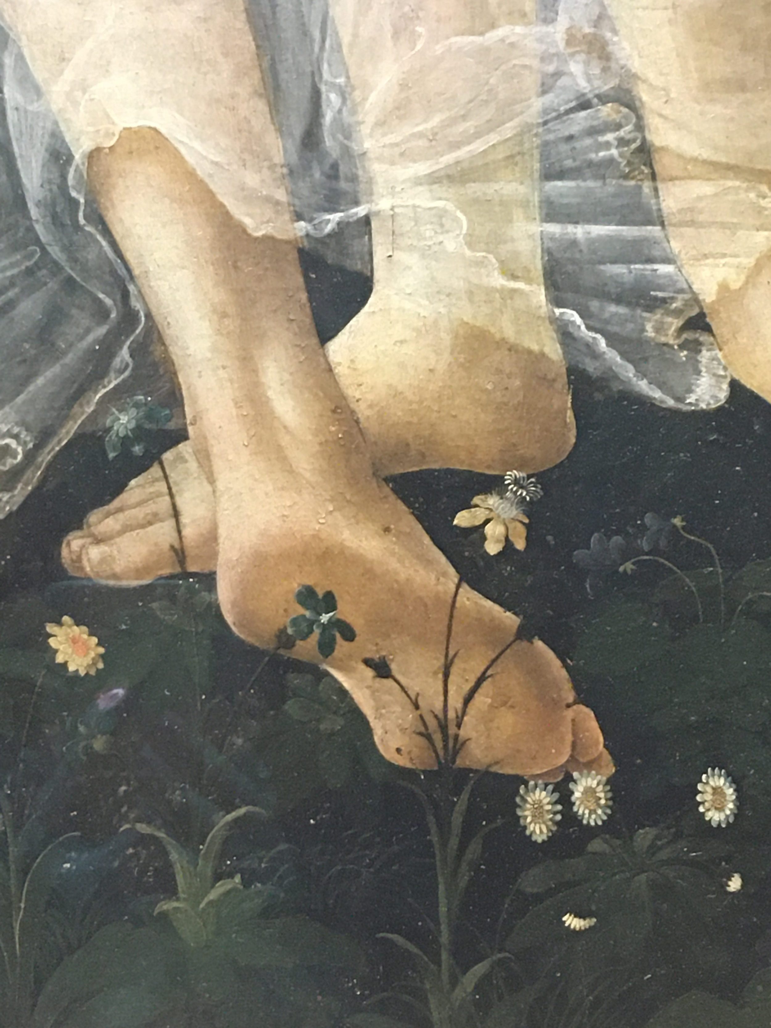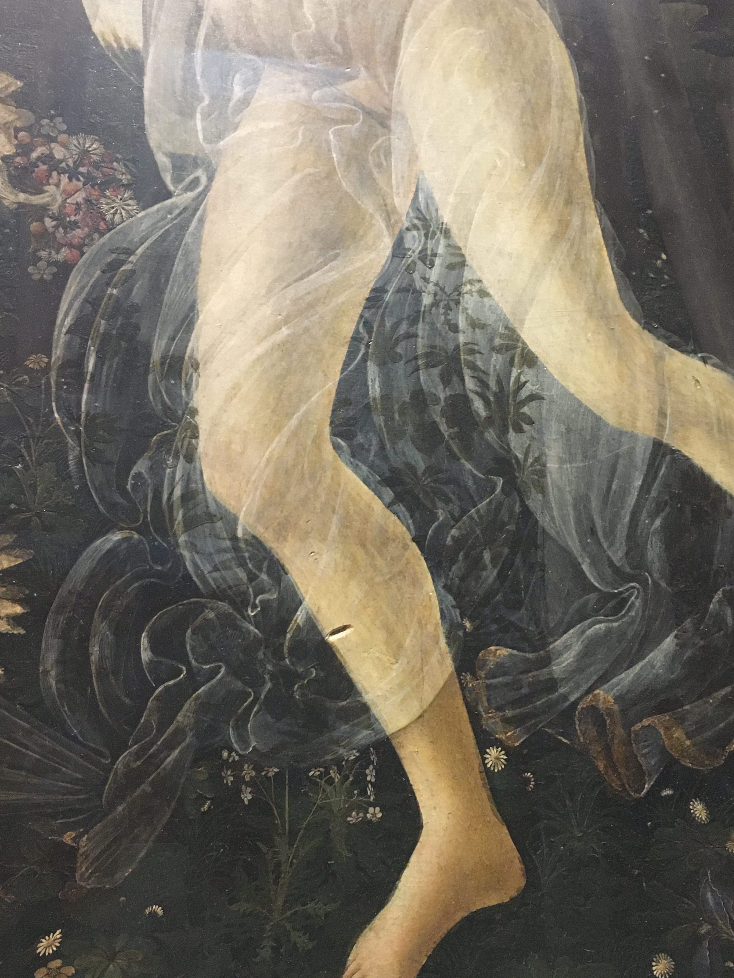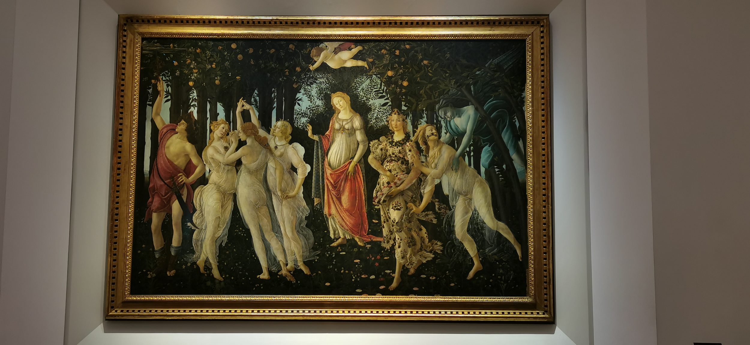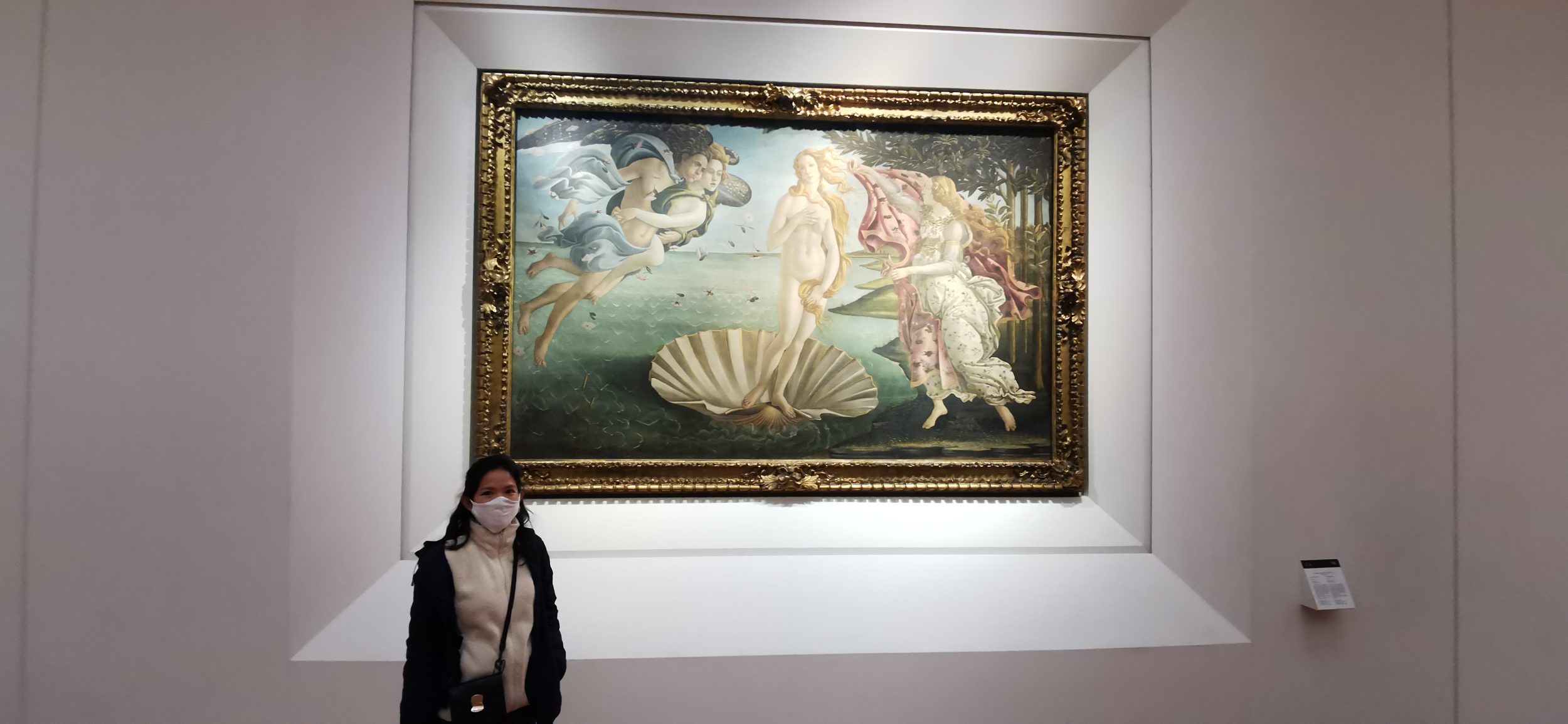 Ich stelle nur ein hässliches Bild ein, damit Sie sehen, wie groß das Gemälde Die Geburt der Venus ist. Ehrlich gesagt, ist dieses Gemälde so bekannt, dass die Leute dachten, sie hätten alles gesehen, alles analysiert, alles aufgeschrieben. Aber auf der Stelle… OMG.