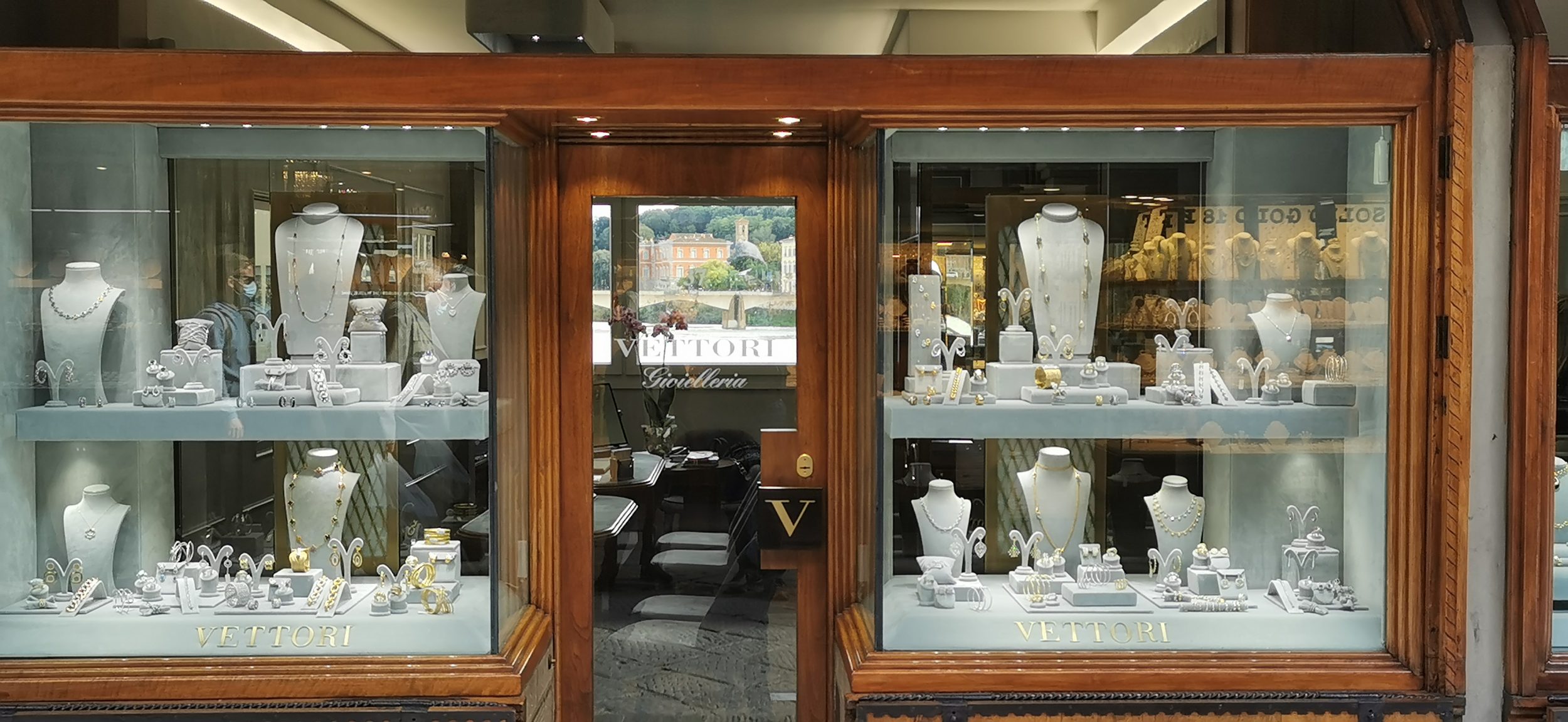 Diese Brücke ist wunderschön. Ich liebe Brücken mit Geschäften darauf, es ist eine glamourösere Version der Rialto-Brücke in Venedig. Hier verkaufen sie nur Uhren und Schmuck. Ich habe lange Zeit damit verbracht, mir jedes Fenster anzuschauen, so schön ist es! Wenn Ihnen einmal die Ideen für Weihnachtsgeschenke ausgehen, schauen Sie sich einfach um. Es gibt einige sehr luxuriöse Produkte, aber auch bezahlbaren Schmuck.