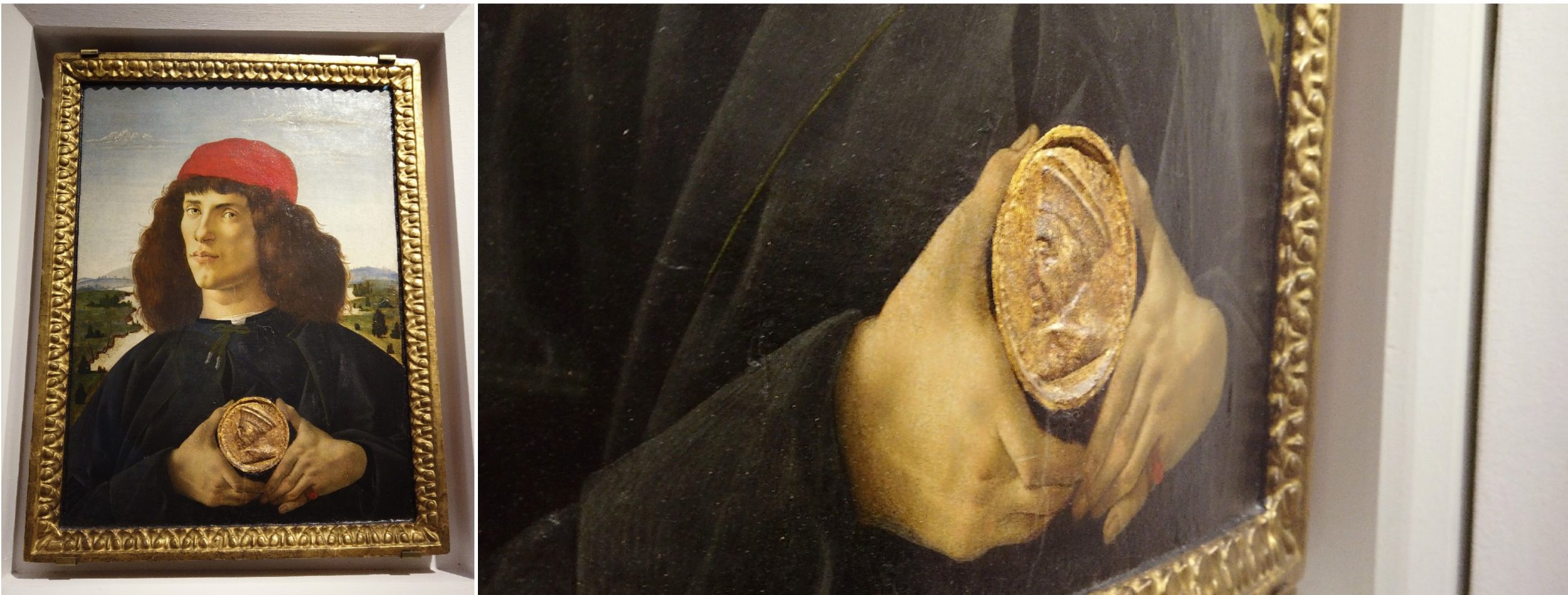 Gleich daneben ein prächtiges Porträt mit 3D-Effekt, ebenfalls von Botticelli Porträt eines Mannes mit einer Medaille von Cosme l’ancien.